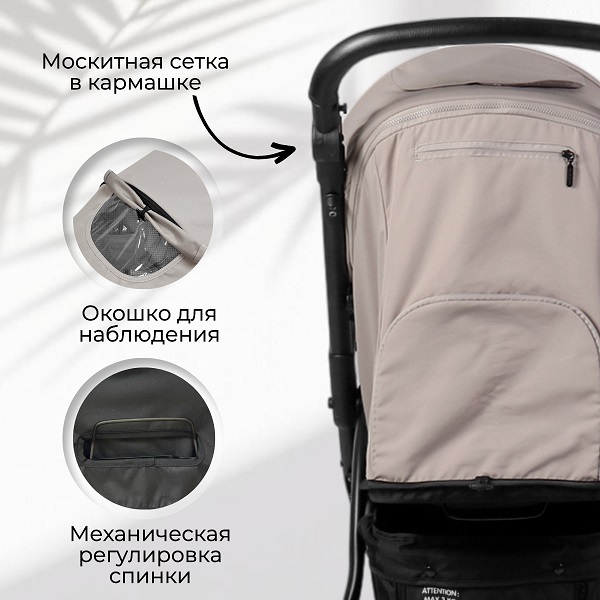 Москитная сетка в окошке для проветривания на спинки защитит от насекомых, а смотровое окно на магните в капюшоне — для контроля за малышом.
