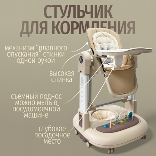 1.Стульчик для кормления — удобное сиденье с регулировкой по высоте и съемным столиком с защитной перекладиной.