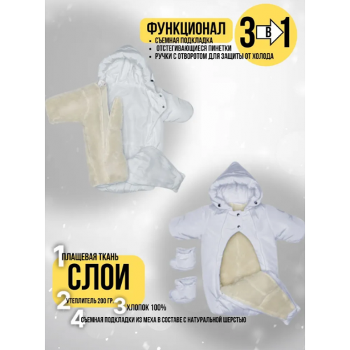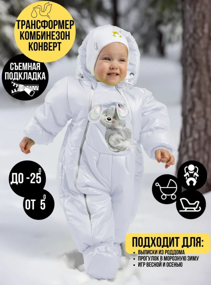 Главная особенность данной модели - это трансформация из комбинезона в конверт при помощи молнии между ножек . Если соединить молнии в другом положении, то комбинезон превратится в конверт с непродуваемым дном. Оптимальный температурный режим для носки - от +5°С до -25°С.