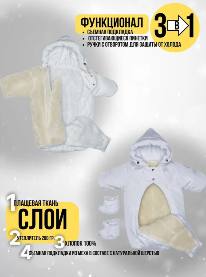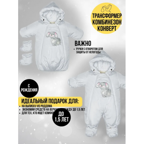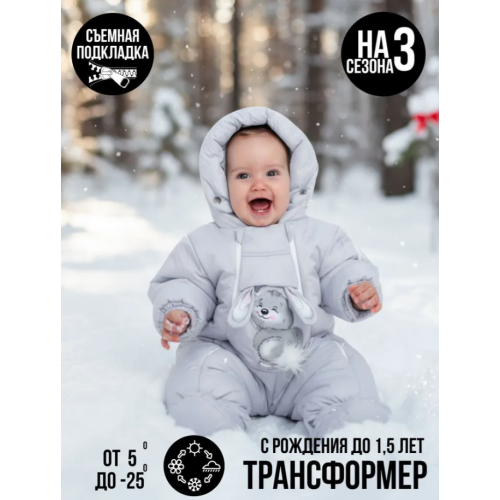 В комплект идут съемные пинетки, которые не будут выделяться из общего стиля и будут греть ножки. С помощью двух удлиненных молний вдоль всего трансформера вы сможете легко одеть и раздеть ребенка.